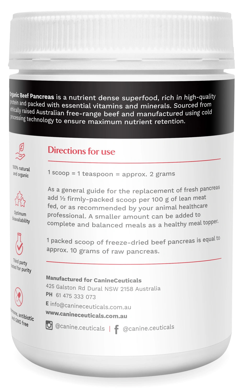 As a general guide for the replacement of fresh pancreas or as a healthy meal topper add ½ firmly packed tsp per 100 g of lean meat fed, or as recommended by your animal healthcare professional.