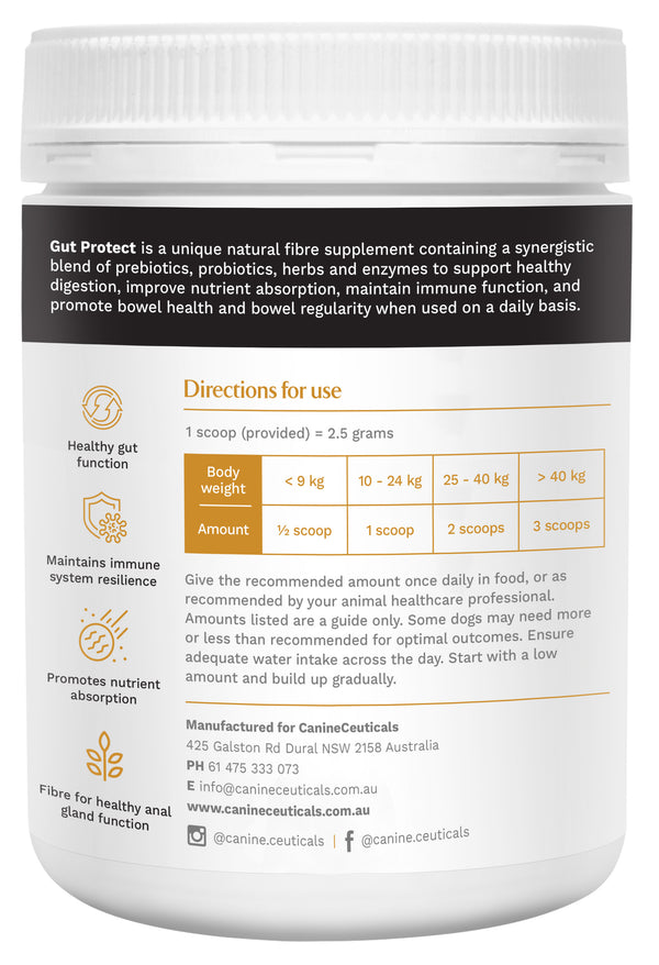 Gut Protect is a unique natural fibre formula containing a synergistic blend of prebiotics, probiotics, herbs and enzymes to support healthy digestion, improve nutrient absorption, maintain optimum immune function, and promote bowel health and regularity on a daily basis.