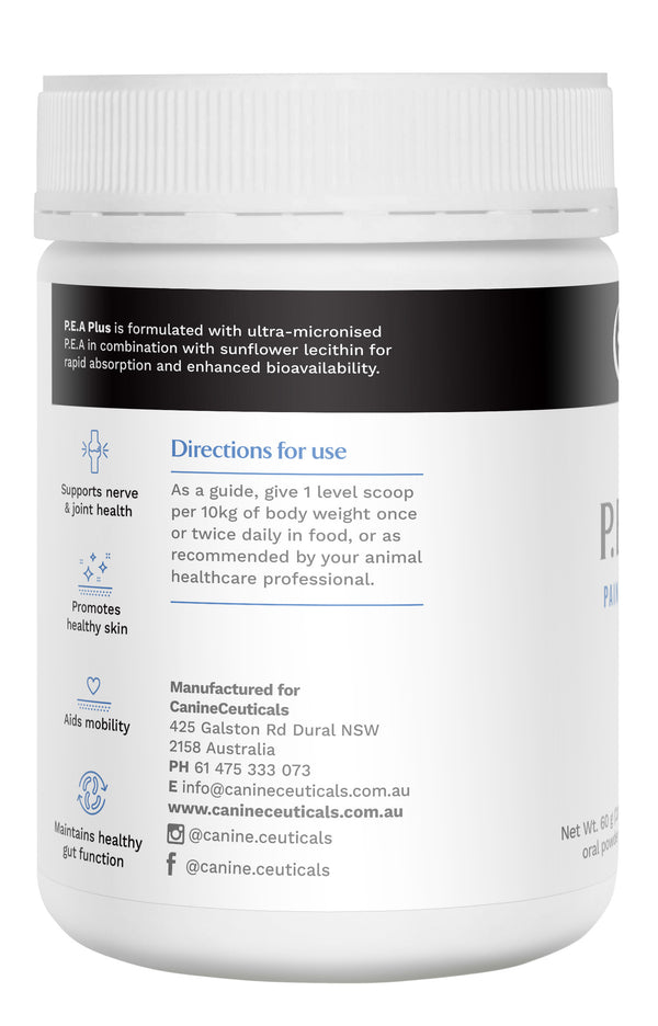 - Contains palmitoylethanolamide (P.E.A), a natural compound with analgesic properties that has been shown to relieve the symptoms of chronic pain in dogs.